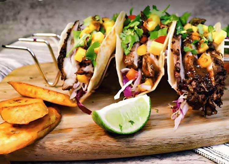 Jerk-spiced grilled salmon served in soft flour tortillas with Caribbean slaw, fresh pico de gallo, and creamy island aioli drizzle.